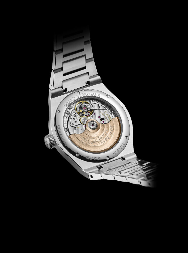 Comfort and elegance converge through the integrated steel bracelet. Rhodium-plated baton hands and a date window at 3 o’clock maintain the dial’s symmetry and balance. The counterweight on the seconds hand, inspired by the iconic Girard-Perregaux Gold Bridge, is a subtle tribute to the brand’s horological DNA