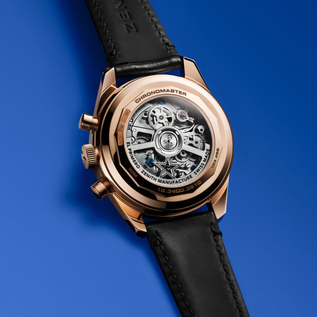The CHRONOMASTER Original Triple Calendar is powered by the automatic El Primero 3610 calibre. This modern variant of the legendary ZENITH chronograph allows for a true 1/10th of a second function. Its steps precisely mark 1/10th of a second against the graduations on the chapter ring: to take full advantage of its 5Hz frequency, its chronograph seconds hand completes one revolution of the dial in 10 seconds, instead of the traditional 60 seconds. Despite the addition of the complete calendar mechanism, the power reserve is 60 hours. The movement’s integrated architecture is visible through the sapphire display case back, revealing a blue column wheel and an open rotor with the ZENITH five-pointed star.